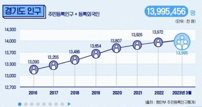 경기도는 공식적으로 4월 말 기준으로 공식 인구 1,400만 명을 돌파하여 대한민국 국민 4명 중 1명이 경기도에서 생활하고 있다고 밝혔습니다. 2002년에는 1,000만 명을, 2016년에는 1,300만 명을 넘어선 '골든크로스'를 기록하며 성장세를 이어오고 있는 것으로 나타났습니다.