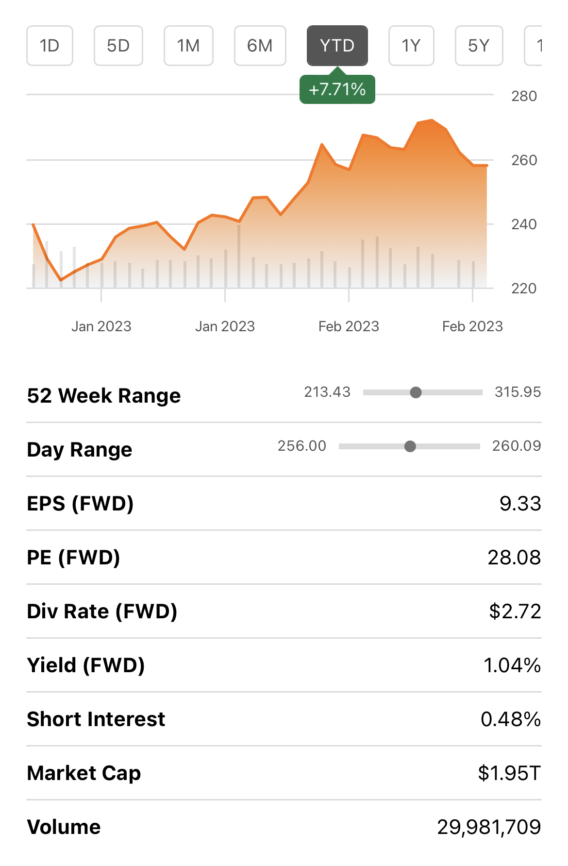 투자자들은 최근 어떤 주식을 더 좋아했을까요? 지난 6개월 동안 마이크로소프트 주가는 11%, 알파벳은 21% 하락했습니다. 전년 동기대비 증감율(YTD)로는 마이크로소프트가 7.71% 수익률, 알파벳은 5.87%을 보입니다. 이는 구매자들이 지난 6개월 동안과 2023년에 마이크로소프트 주식을 선호했음을 나타냅니다.